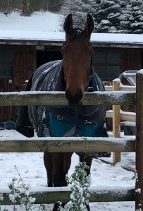 The snow from last week has taken a long time to clear. Tiger and Netty, the two ponies, and George the horse, are sick of the snow and ice. They’ve had to stay in the stable at night because the yard has been frozen over. The ponies are okay with that…a night in a cosy stable, with a deep bed of shavings and a hay net of their own. George hates it so all through the night we can hear thump! Thump! Crash! as George throws himself around the stable and kicks the door, so we know he is cross. If there is deep enough snow and the yard isn’t slippy they are allowed out in the day but last week we had one day where the yard was just sheet ice the whole day so they had a whole 38 hours straight in their stable. George was so livid he managed to push a hole in the stable wall with his bottom by body-slamming himself backwards into the stable wall until it gave way. This is George…