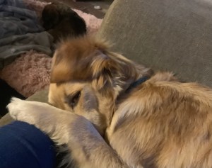Today’s writing companion is Gwen, the bog-snorkelling retriever. She is trying to tempt me to cuddle her instead of concentrating on writing to you….
