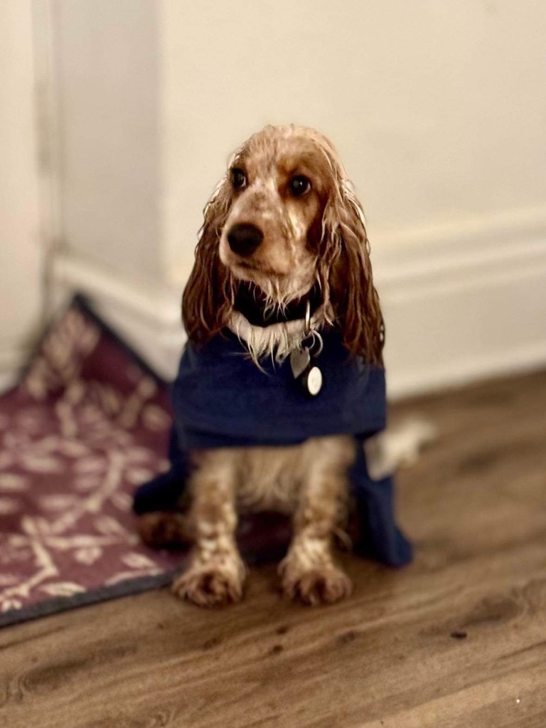If any of you have ever owned a spaniel, you will understand why she needs a dressing gown. The minute she is picked from the bath, holding on to as much bath water as possible, particularly in her ears, she goes zooming round the house, over the beds, over every chair, cushion, soft furnishing in the house, making everything just as soggy as her.