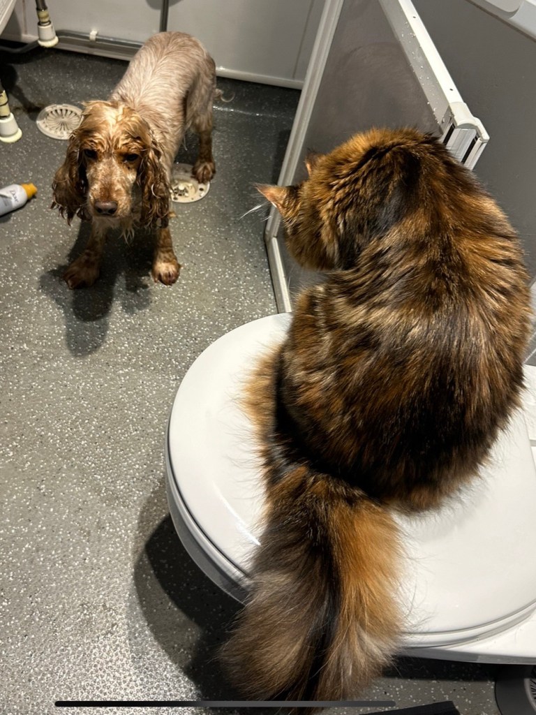 My daughter got Ahsoka, and named her after her favourite Star Wars character, after she did a big deterioration in her health and found it more difficult to leave the house. She also, knowing that she may not have a huge amount of time left as she is receiving palliative care, didnt want to leave Carrie her assistance dog without a friend. She was worried that because Carrie is always by her side and even goes into the hospice with her, she would fret and pine when she goes. So my daughter got Ahsoka on Carrie’s birthday, as a birthday present for her. It worked! They adore each other. They play together, wash each other and curl up to sleep together. My daughter has a hospital bed to sleep in, a single bed…and trying to fit herself, Carrie and an ever-growing cat into the bed is becoming challenging. It seems that Maine Coons keep growing til they are 3 years old and she is still only 8 months now! I’ve put a picture of Carrie opening her birthday presentnext to this. It’s not a brilliant quality photo but it was difficult to get a good photo because Carrie was just so excited.