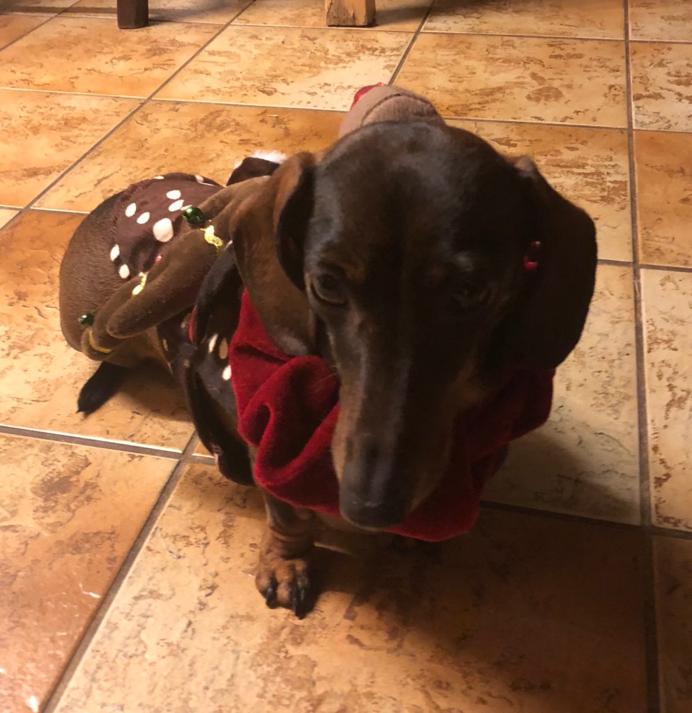 Talking of Dilys, she has her own little Christmas tradition. At the beginning of December, when all the decorations come in from the barn, Dilys gets all excited. She sticks her nose into the boxes and starts rooting around. Her very first Christmas, when she was only 6 months old, I bought her a red velvet ruffled collar with bells all round it. The bells were quickly pulled off by her, but ever since, every day of December, Dilys wears her collar….and doesn’t she think she looks beautiful! She insists on greeting everybody to show off her new collar, so she races to answer the door to carol singers, delivery men, nurses, the lot. At night we take her collar off and hang it on a hook above her basket which is in front of the fire in the kitchen, then in the morning when we get up, she barks at the collar over and over, until we give in and put it back on her, so she can go and show a whole load of people what a beautiful and festive sausage dog she is.